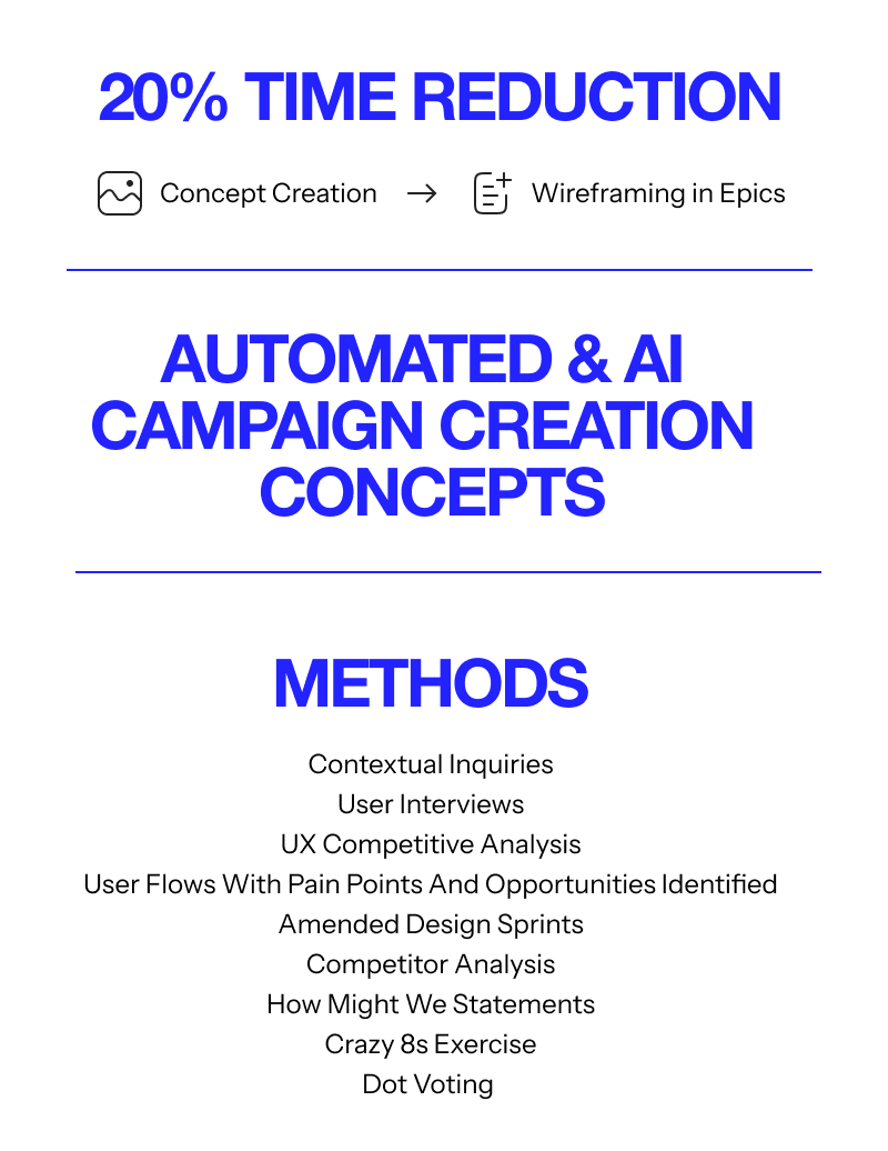The UX team wanted to conduct a study of blue sky thinking for longer lasting improvements, as well as classify strategic product updates as a “crawl, walk, or run” to make the suggested solutions palatable to cross-functional teams. I led 4 UX researchers in planning and conducting contextual inquiries, user interviews, and a UX competitive analysis to build out cohesive end-end user flows, with pain points, opportunities, and example UI and patterns to present and circulate to the tech org. We prioritized the campaign setup process - a core first step in-app for media planning and buying - as our initial area of focus.