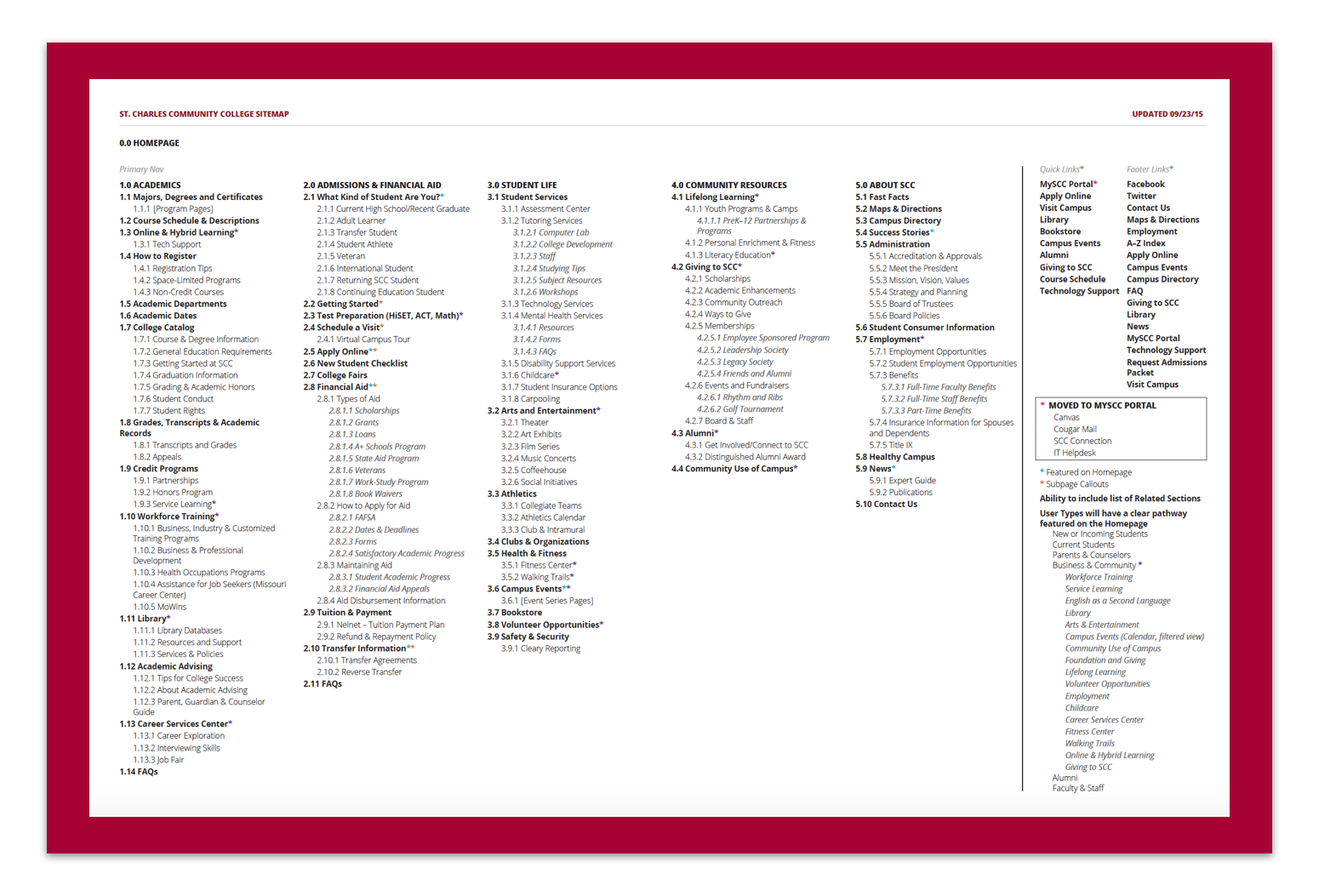 Sitemaps are the blueprint of an application or site. Content hierarchy needs to intersect with user flow for the best organization. SCC had several different student and stakeholder types to reach, so the sitemap had to cater to each type.